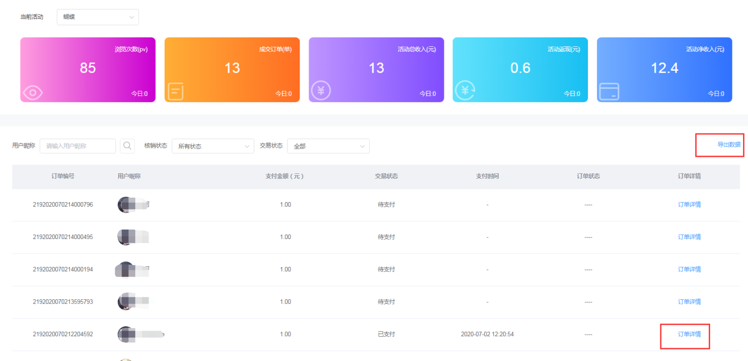 活动订单查询,可查看订单详情,所属上级及导出订单数据,所有信息一目了然