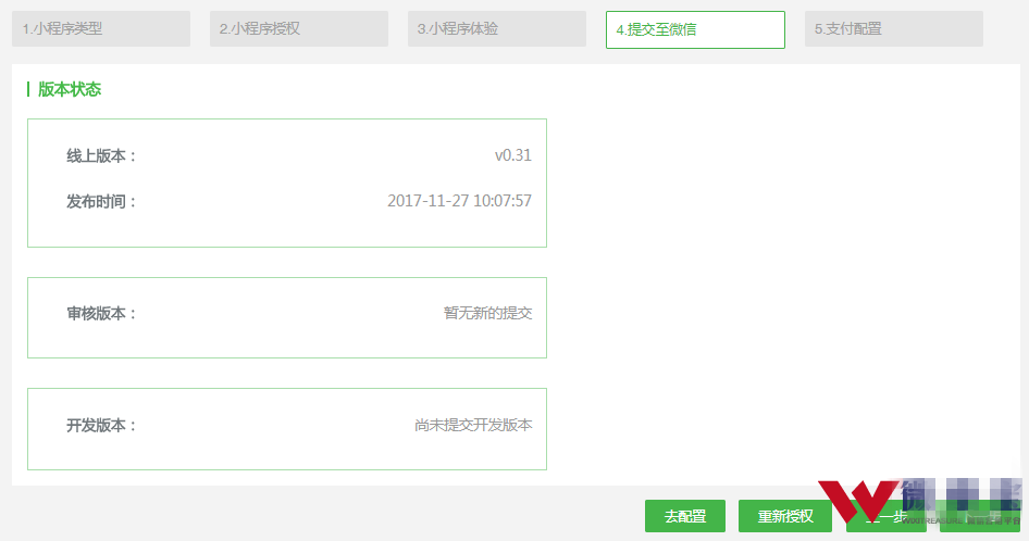 4)提交至微信:商家在此页面可以看到小程序当前版本,如果发布最新版本,商家也可以在此更新。