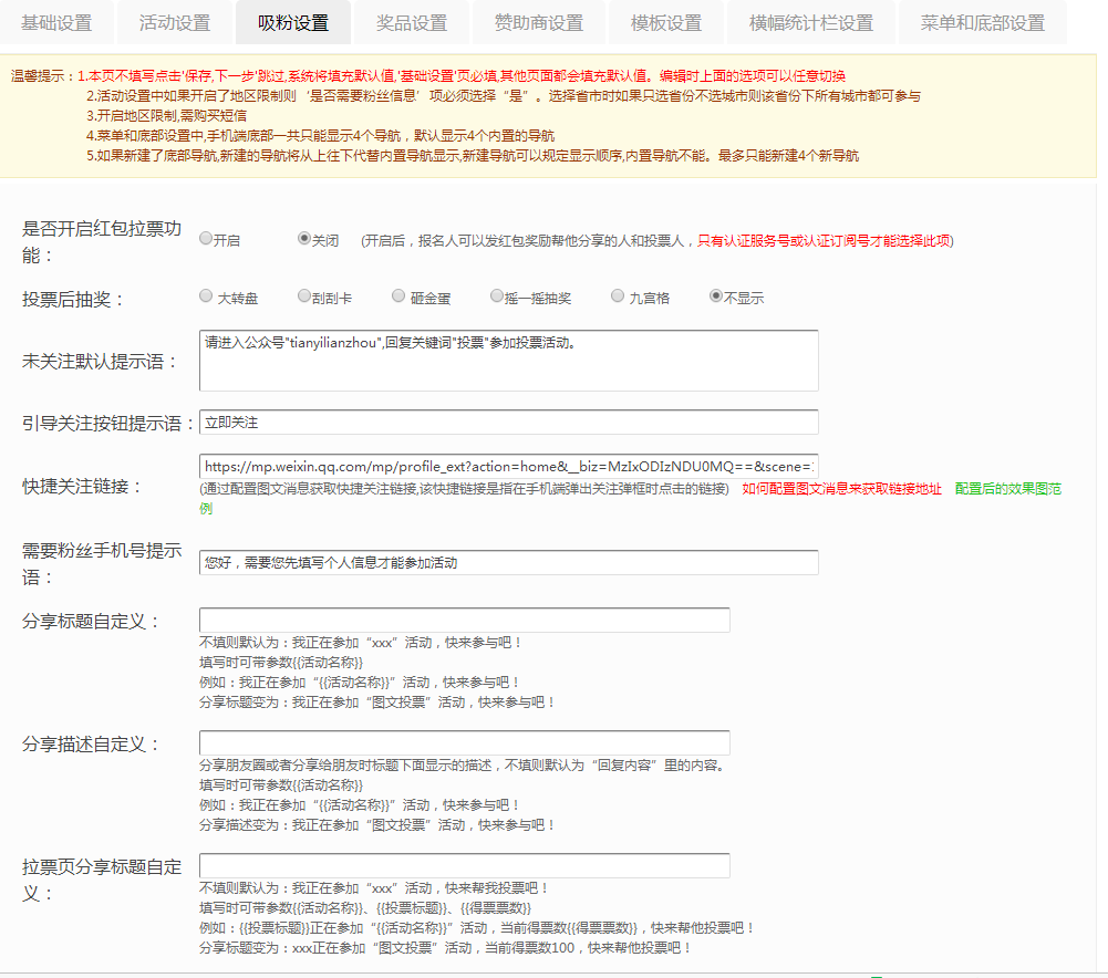 1.可自定义活动标题、活动图片、活动描述、分享时的标题、分享时的摘要、引导关注素材、人气规则说明